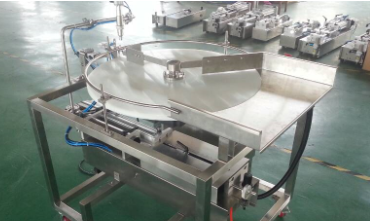 工人將瓶子放在送瓶台上,然後桌子會將瓶子送入傳送帶。